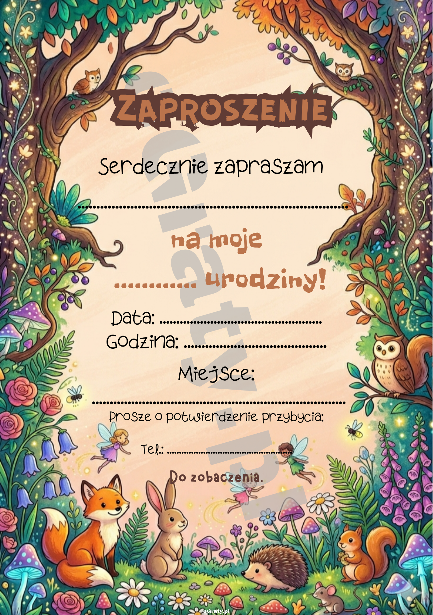 Zaproszenie na urodziny do druku — styl leśne zwierzaki